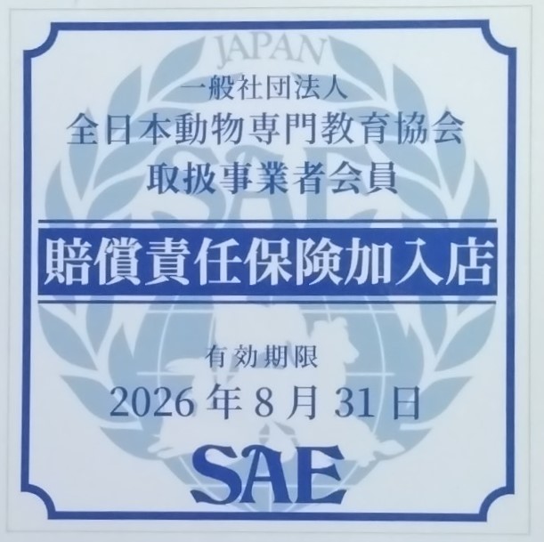 また、万一に備え、動物取扱事業者賠償責任保険に加入しております。